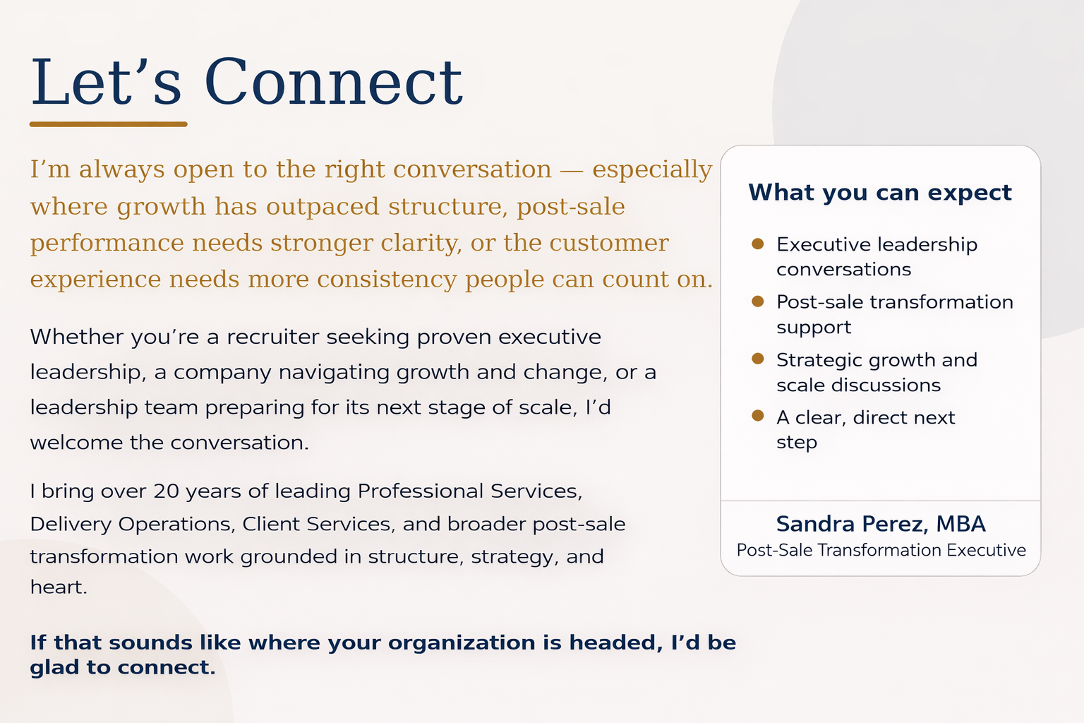 I’m open to executive leadership opportunities, strategic transformation roles, and select fractional engagements where growth has outpaced structure and post-sale performance needs stronger clarity, accountability, and trust.